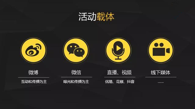 活动载体特别多,例如微博,微信这几个比较大的平台。微博微信最大的区别在于微博是一个广场式的东西,所有人都能看到你的东西,而微信是你不关注对方就不知道他干了什么事情。